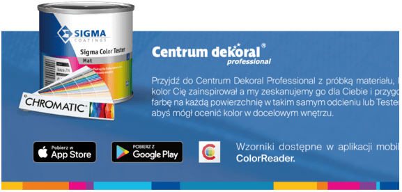 Wpisując się w obecny od lat trend personalizacji w sieci Centrum Dekoral Professional, stanowiących nie tylko produktowe, ale i doradcze zaplecze marki, została uruchomiona usługa SERWISU KOLORU, sygnowana jakością Sigma Coatings. W sklepach należących do sieci pojawią się zaawansowane technologicznie kolorymetry (Color Reader Pro), umożliwiające natychmiastowe odczytanie koloru z dowolnego materiału lub powierzchni - np. tkaniny, płytki czy okładziny.