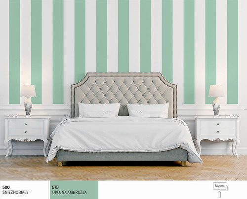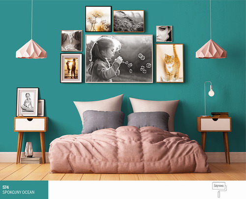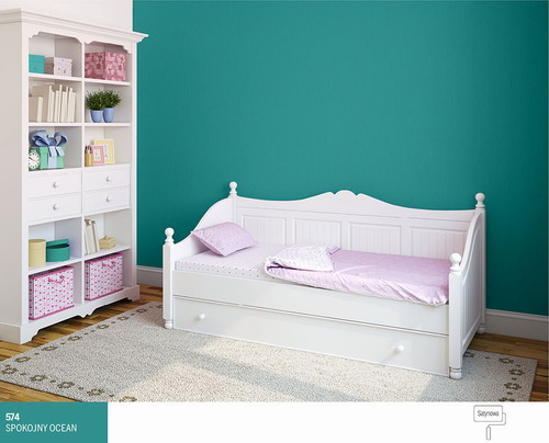 Planując pomalowanie sypialni na turkusowo, warto użyć jednego z niezwykle klimatycznych odcieni znajdujących się w kolekcji farb Śnieżka Satynowa, takich jak 574 Spokojny Ocean lub 575 Upojna Ambrozja.