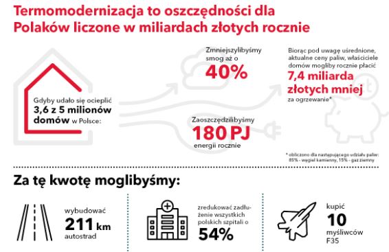 Przeprowadzenie termomodernizacji to najefektywniejszy sposób na obniżanie zużycia energii, a także na walkę ze smogiem. Ocieplenie 3,6 milionów domów jednorodzinnych pozwoliłoby rocznie zaoszczędzić 180 PJ energii (50 000 000 MwH). Przeliczając to na surowce, wynosi to równowartość 6,5 mln ton węgla i 5,23 m3 gazu ziemnego! Rocznie w kieszeniach Polaków mogłoby zostać aż 7,4 miliarda złotych - moglibyśmy za to zbudować 211 kilometrów autostrad, zmniejszyć dług wszystkich polskich szpitali aż o 54% i kupić 10 myśliwców F35.