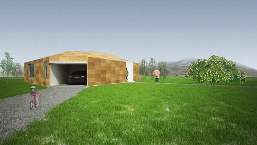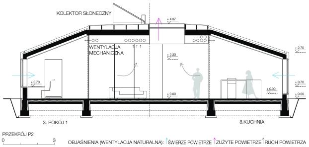 Poszukując wydajnego systemu okładzinowego, elewację pokryto panelami korkowymi. Świadome rozmieszczenie zieleni chroni przed zmianami czynników pogodowych, zarówno latem, jak i zimą. Rośliny iglaste, posadzone od strony północnej zatrzymują zimny wiatr, zaś drzewa liściaste rosnące na południe zapobiegają nadmiernemu nagrzewaniu domu. Istotnym rozwiązaniem pasywnym jest sposób przepływu powietrza. "Dzięki formie budynku bardzo skuteczna jest naturalna wentylacja. Natomiast z architektonicznego punktu widzenia najważniejszy jest prorodzinny charakter domu" - podsumowuje Krajewska.