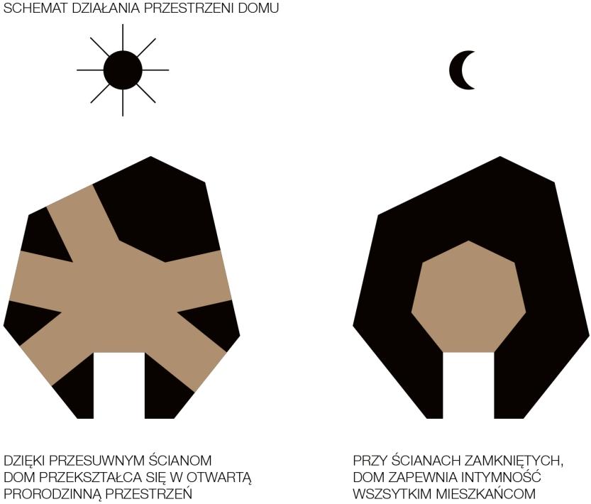 "Ekosystem" wykorzystuje przyjazne środowisku rozwiązania już na poziomie samej konstrukcji i bryły budynku. Wielkość i mobilność poszczególnych układów sprawiają, że możemy w sposób precyzyjny dostosować pomieszczenia do rozchodzenia się światła. W dodatku, utrzymanie ich w jasnych barwach, z dominującymi, białymi ścianami pozwala w znacznym stopniu ograniczyć zapotrzebowanie na sztuczne oświetlenie. Centryczny układ otulający pokój dzienny, skupia energię we wnętrzu domu i zapobiega jej nadmiernej utracie" - mówi Ligia Krajewska ze studia architektonicznego Exexe.