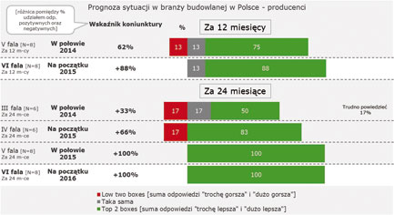 Podobnie jak w V edycji pomiaru, perspektywa 24 miesięcy dla wszystkich pytanych producentów (100 proc.) oznacza w polskim budownictwie zmiany na lepsze. W porównaniu z poprzednią falą badania wzrósł odsetek producentów prognozujących znaczną poprawę – uważa tak obecnie 38 proc. badanych, natomiast 63 proc. spodziewa się nieznacznej poprawy (w poprzednim pomiarze nieznaczne polepszenie przewidywało 88 proc. badanych).