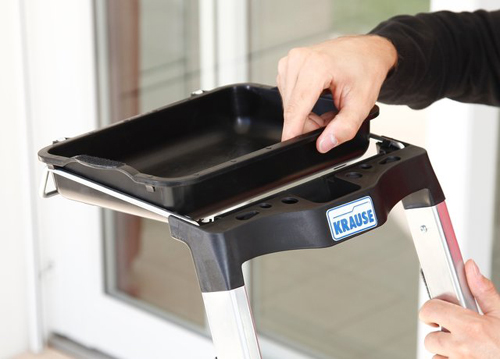 Seria drabin Solidy to doskonałe rozwiązanie do wielorakich prac wewnątrz pomieszczeń. Na uwagę zasługuje pałąk bezpieczeństwa zintegrowany z półką na drobne narzędzia oraz hakiem na wiadro, niezbędne podczas prowadzonych porządków. Nieco więcej miejsca, a tym samym większą funkcjonalność oferuje pogłębiona półka do drabin z serii Safety, Securo, Sepro oraz Solido. Wykonana z wytrzymałego tworzywa sztucznego gwarantuje długie użytkowanie, a duża ilość praktycznych przegródek i otworów sprawia, że wszystkie potrzebne narzędzia i akcesoria możemy mieć zawsze pod ręką. Kolejną w pełni uniwersalną - przystosowaną do wszystkich drabin dwustronnych ze szczeblami, propozycją firmy KRAUSE jest ToolBag - praktyczna, zawieszana torba na narzędzia wykonana ze wzmocnionego tworzywa sztucznego o wymiarach 290x570 mm i nośności do 10 kg. Ostatnim rozwiązaniem niemieckiego producenta jest system MultiGrip, czyli obszerny, rozkładany pojemnik z uchwytem na wiadro (dostępne w ramach akcesoriów dodatkowych), hakiem oraz uchwytami na kabel.