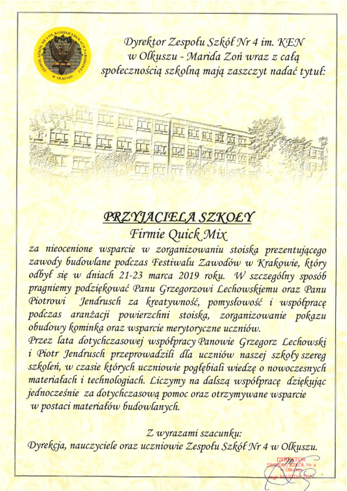Dyrektor Zespołu Szkół Nr 4 im. KEN w Olkuszu wraz ze społecznością szkolną nadali firmie quick-mix tytuł Przyjaciela Szkoły. Wyróżnienie to firma otrzymała w podziękowaniu za wsparcie w zorganizowaniu stoiska prezentującego zawody budowlane podczas tegorocznego Festiwalu Zawodów w Krakowie.