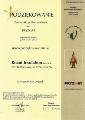 Od kilku lat Knauf Insulation współpracuje z Polską Akcją Humanitarną. W 2008 r. w ramach promocji "Ekologiczne ocieplenie w ekonomicznej cenie" 10% ze sprzedaży wełny mineralnej Knauf Insulation zostało przekazane PAH w celu pomocy powodzianom.