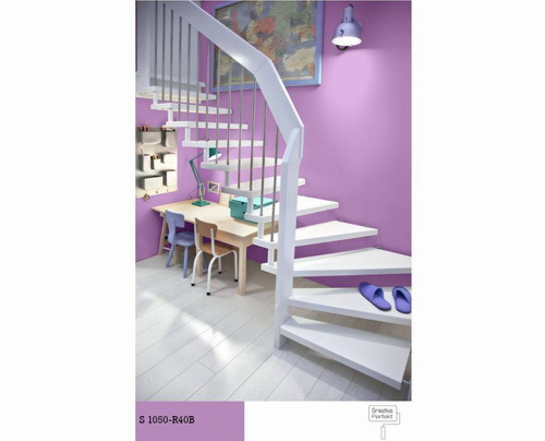 Jeśli projektujesz przestrzeń, której częścią składową są schody, warto zadbać o to, by stanowiły one spójną całość z otoczeniem. Nie będzie zaskoczeniem fakt, że spójność można uzyskać również poprzez zastosowanie kontrastów, dlatego proponujemy piękny zestaw białych schodów mocowanych przy ścianie malowanej kolorem z palety barw jagodowych.