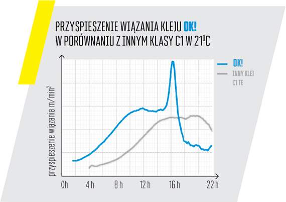 Wykres 1. Przyspieszenie wiązania kleju OK oraz innych klejów klasy C1 w pierwszych 12 godzinach (temp. 21 stopni C). Od początku wyraźnie widać przewagę OK w porównaniu z pozostałymi klejami klasy C1TE. Już po 12 godzinach można rozpocząć fugowanie płytek na ścianach.