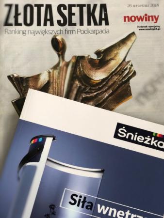 Fabryka Farb i Lakierów Śnieżka SA kolejny rok z rządu uplasowała się na wysokiej pozycji rankingu "Złota Setka Firm Podkarpacia", publikowanego przez "Gazetą Codzienną Nowiny". Spółka znalazła się także w pierwszej dziesiątce prestiżowego zestawienia 100 Podkarpackich Firm 100-lecia, które autorzy przygotowali specjalnie z okazji 100-lecia odzyskania niepodległości przez Polskę.