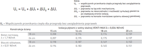 Nowe wymagania w zakresie izolacyjności i ochrony cieplnej budynku wniosły obowiązek uwzględniania szeregu poprawek podczas obliczania współczynnika przenikania ciepła U. Dla fasad wentylowanych pod uwagę powinniśmy brać poprawki wynikające z wybranego sposobu mocowania materiału izolacyjnego, a także z samych warstw ściany. Na ostateczną izolacyjność termiczną mają bowiem wpływ takie czynniki, jak łączniki mechaniczne, nieszczelności w warstwie izolacyjnej, cyrkulacja powietrza po cieplejszej stronie izolacji czy konsole montażowe systemu panelowego elewacji. Zależności te obrazuje wzór: