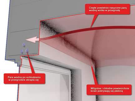 Zjawisko to obserwujemy często wewnątrz pomieszczeń - na słabo izolowanych i tym samym zimnych ścianach zewnętrznych. Powietrze w pomieszczeniu ma temperaturę 22°C, a temperatura ściany często wynosi nie więcej niż 8°C, co daje nam różnicę temperatur 14°C. Tam, gdzie ciepłe powietrze ma styk z zimną ścianą ochładza się i dochodzi do zjawiska skraplania się pary wodnej – ściana staje się wilgotna.