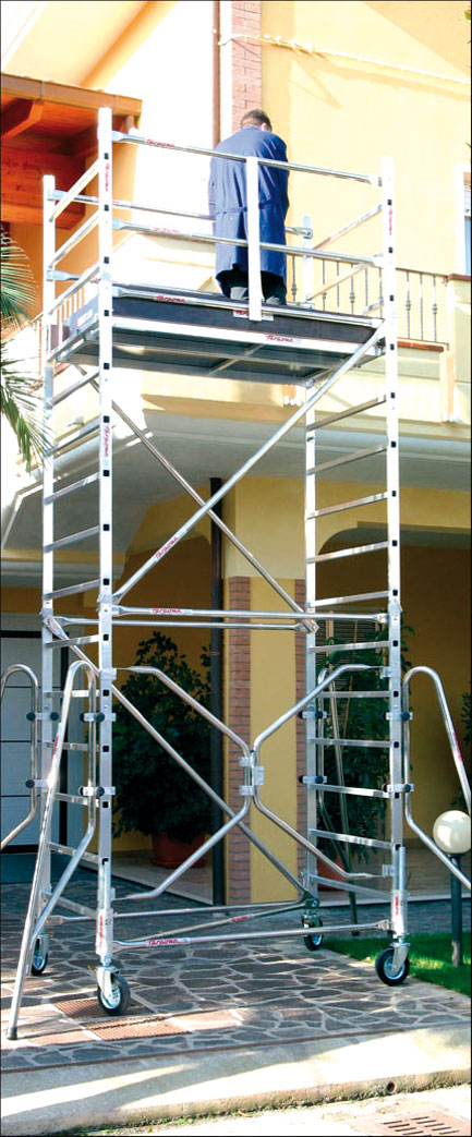 Rusztowanie jezdne o szerokości 135 cm może występować w wersji z wewnętrznymi schodami aluminiowymi z szerokimi na 15 cm stopniami. Maksymalna nośność schodów wynosi 160 kg. Zestaw z wygodnymi schodami i stabilnymi poręczami umożliwia przenoszenie niewygodnych ładunków. Podest jest antypoślizgowy.