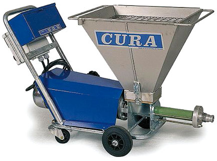 Agregat Cura 10 przeznaczony jest do podawania szpachli i gładzi oraz różnego rodzaju tynków (renowacyjne, akrylowe, żywiczne itd.) o średnicy ziarna do 4 mm. Maksymalna wydajność urządzenia wynosi 6 l/min., odległość podawania 20 m, a wysokość 15 m. Agregat waży 50 kg.